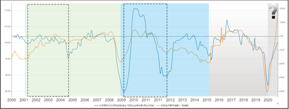 在圖3中,近二十年間我國宏觀經(jīng)濟經(jīng)歷了兩輪較顯著且較為完整的經(jīng)濟周期波動,第一輪是2001~2008年,第二輪是在2008~2015年,兩輪周期均為七年左右,而每輪宏觀經(jīng)濟周期下化工行業(yè)景氣度又各經(jīng)歷了兩輪小周期波動。按照上述運行節(jié)奏,2020~2022年應正處于一輪宏觀經(jīng)濟周期的尾聲或經(jīng)歷一輪化工行業(yè)小周期。但2020年初突如其來的疫情打亂了我國經(jīng)濟運行的節(jié)奏,化工行業(yè)和宏觀經(jīng)濟景氣度加速探底,讓原本七年一輪的宏觀周期和三年輪的行業(yè)小周期變得難以判斷。