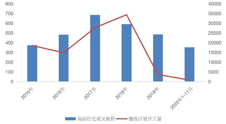 圖:2015-2020年煙臺商品住宅成交面積及棚改計劃開工量(萬平方米、套)