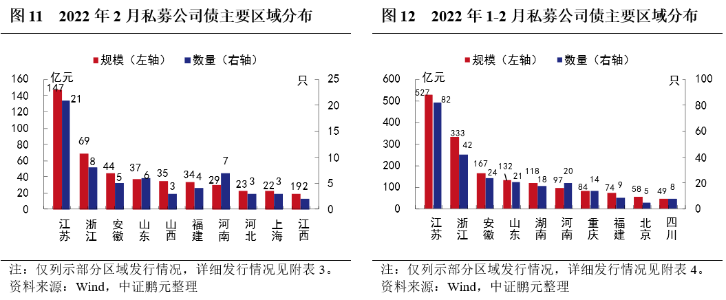 私募公司債券方面,2022年2月份,公募公司債券的發行人分布于21個地區,以江蘇、浙江、安徽等地為主。從發行規模來看,江蘇發行146.63億元位居榜首,浙江發行68.50億元位居第二,安徽發行44.40億元位居第三位,發行數量分別為21只、8只、5只。浙江、安徽、福建分別以累計凈融資68.50億元、44.40億元、29.20億元位于前三位,廣東、云南、上海分別凈償還14.80億元、13.30億元、13.00億元。綜合1-2月,江蘇以發行82只、累計發行規模527.28億元位居首位,遠高于其地區;浙江以發行42只、累計發行規模333.12億元位居第二;安徽以發行24只、累計發行規模167.40億元位居第三;浙江、安徽、江蘇分別以累計凈融資278.50億元、153.79億元、146.88億元位于前三位,北京、廣西、上海分別凈償還33.00億元、20.71億元、20.47億元。