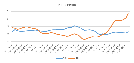 據(jù)國(guó)家統(tǒng)計(jì)局?jǐn)?shù)據(jù)顯示,10月PPI再次創(chuàng)下歷史新高,達(dá)13.5%;CPI同比上漲1.5%,較上月回升0.8%,與PPI剪刀差處于歷史最高位。