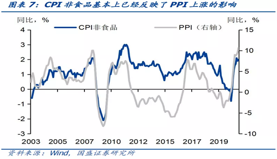 實(shí)際上,PPI向CPI的傳導(dǎo)早已就開始。據(jù)國(guó)盛證券表示,以非食品CPI走勢(shì)已反映了工業(yè)品價(jià)格上升影響,與PPI走勢(shì)高度同步。