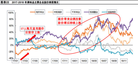 如海天味業(yè)18年全年上漲31.92%,中炬高新上漲20.86%,涪陵榨菜上漲31.6%,千禾味業(yè)雖然全年漲幅為負(fù),但上半年仍上漲37.5%。