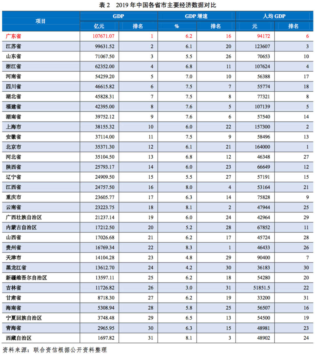 廣東省是中國開放程度最高、經濟活力最強的區域之一,經濟總量長期位居中國第一,人均GDP在中國名列前茅,受國家經濟發展政策支持力度大,經濟發展態勢良好。2019年,廣東省財政收入排名中國第一,且大幅領先其他省市,一般公共預算收入穩定性強,財政自給程度較高,整體財政實力很強。2019年廣東省政府負債率為11.10%,與其他省市相比,政府債務負擔很輕;廣東省政府債務率為57.60%,償債能力很強。