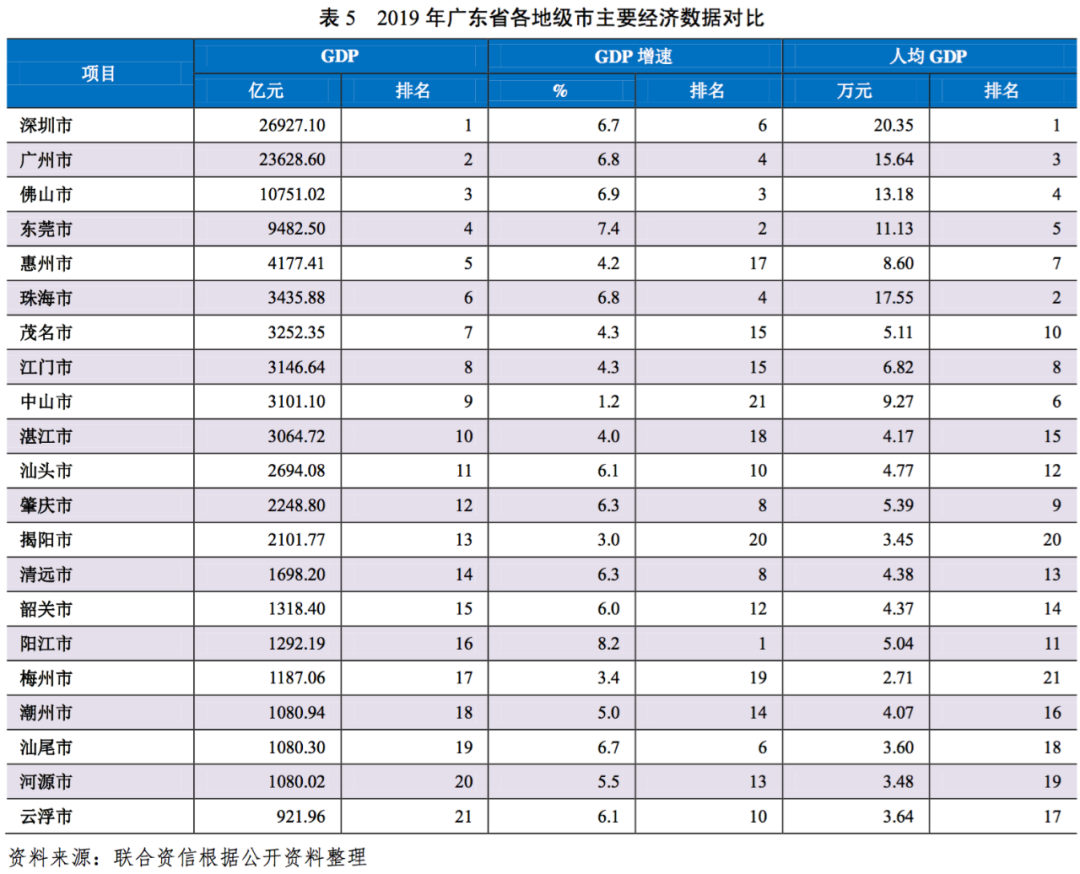 從人均GDP看,2019年珠三角地區中5個地級市人均GDP超過10萬元,其中深圳市人均GDP為20.35萬元,排名廣東省第一名;沿海經濟帶和北部生態發展區大部分地級市人均GDP不足5萬元。