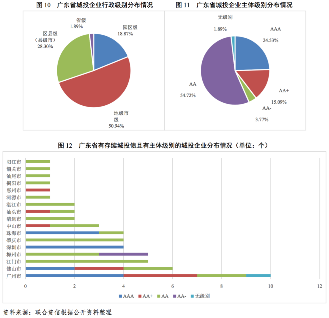 截至2020年9月底,廣東省內有存續債券的53家城投企業中,AAA級13家,AA+級[1]8家,AA級30家,AA-級2家,無主體信用級別1家;其中,AAA級和AA+級發債城投企業主要分布在廣州市、深圳市、珠海市和佛山市,主體級別較高的發債城投企業均集中在珠三角地區。