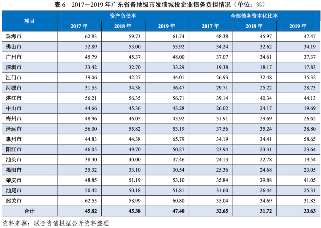 2019年,廣東省發債城投企業的債務負擔同比有所加重,受債務集中到期影響,廣東省各地市的發債城投企業短期償債能力指標有所弱化,償債壓力持續加大。