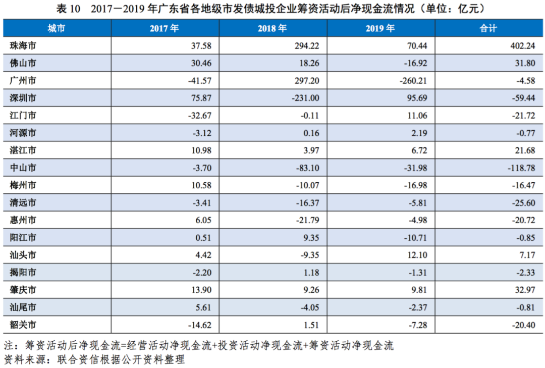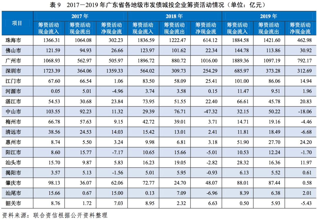 從廣東省各地級市發債城投企業籌資活動現金流看,2017-2019年,除廣州市、深圳市和珠海市外,其他各地級市發債城投企業籌資活動現金流相對較小;2019年,廣州市、深圳市和珠海市發債城投企業籌資活動現金凈流量分別為792.17億元、312.69億元和462.98億元。