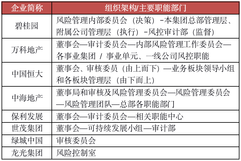 強化風險防控是企業經營中的必要之舉,風險防控包括風險識別、風險評估、風險應對、風險報告等一系列程序與流程,不僅需要設立專門的組織架構、配置專業人員,還需要制度、技術支撐。隨著風險管理意識和認知的不斷提升,各房企都在積極構建、完善自身的風險防控制度與體系,如萬科地產、中國恒大、保利發展、中海地產等。