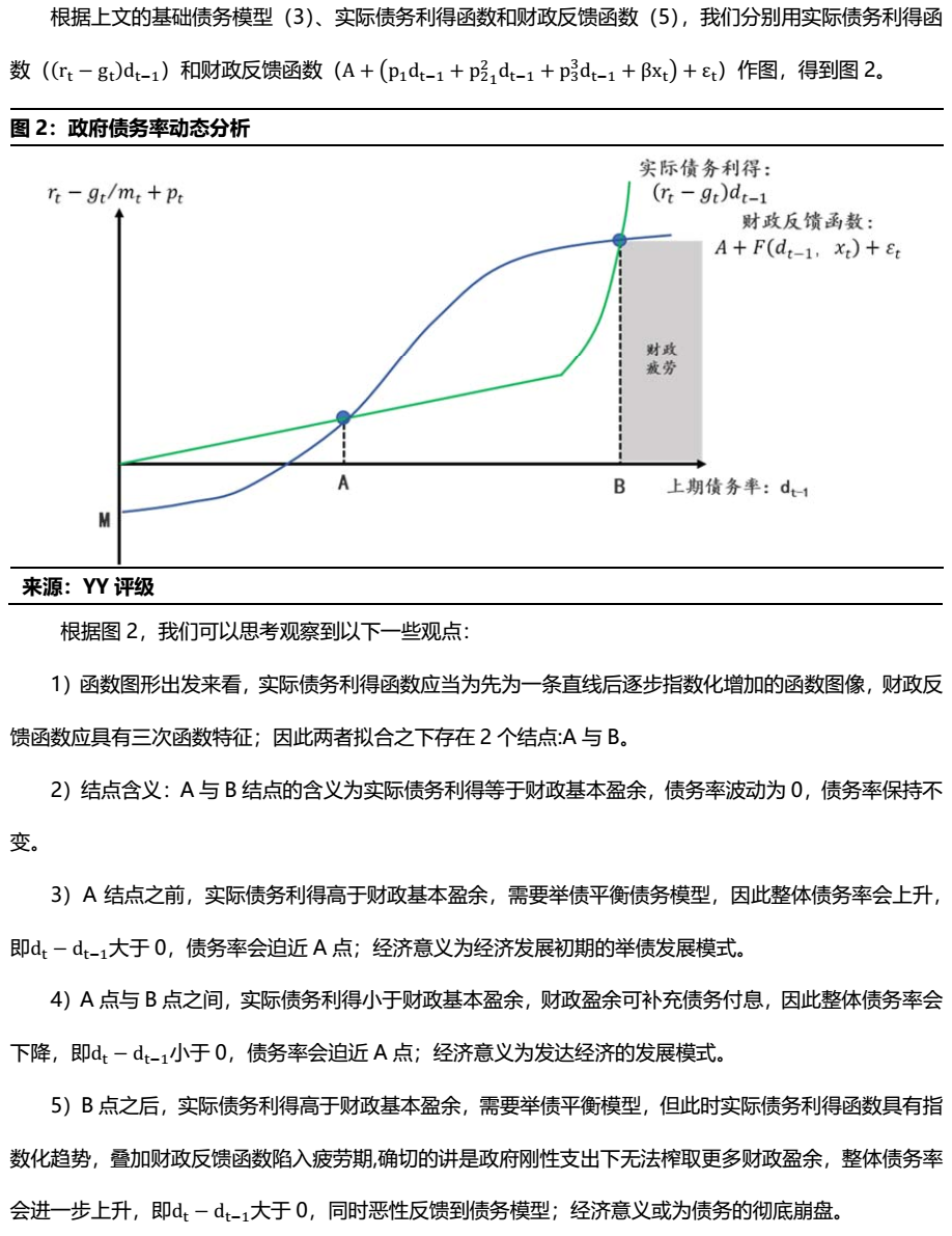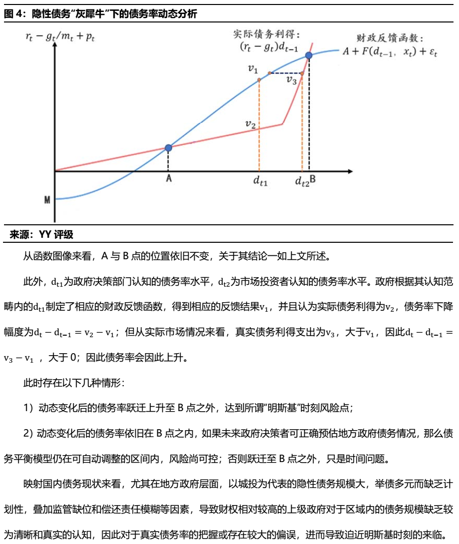 具體來看,我們從財政平衡模型出發(fā),構(gòu)造出實際債務(wù)利得函數(shù)和財政反饋函數(shù),兩者動態(tài)變化下推演債務(wù)率的一個動態(tài)變化過程,點出城投和債務(wù)“明斯基時刻”存在的必然性和具體情形。