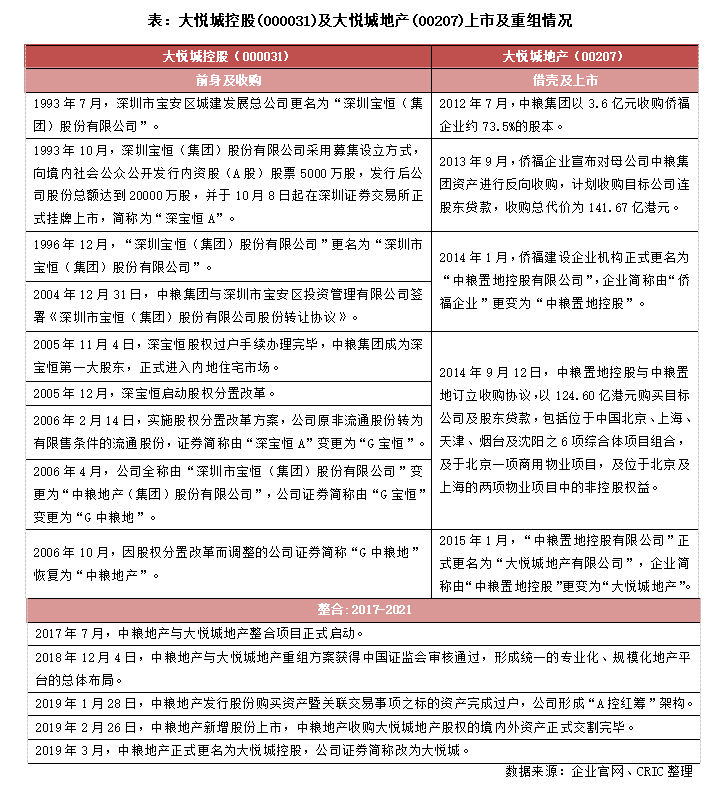2011年,在國資整合大背景下,中糧集團(tuán)將中糧置業(yè)、中糧地產(chǎn)、酒店事業(yè)部、海南公司進(jìn)行整合,形成了“中糧置地”統(tǒng)一的地產(chǎn)業(yè)務(wù)平臺;此后2012年至2014年旗下投資物業(yè)通過僑福企業(yè)借殼上市,并將僑福企業(yè)更名為中糧置地控股,2015年再次更名為大悅城地產(chǎn)。