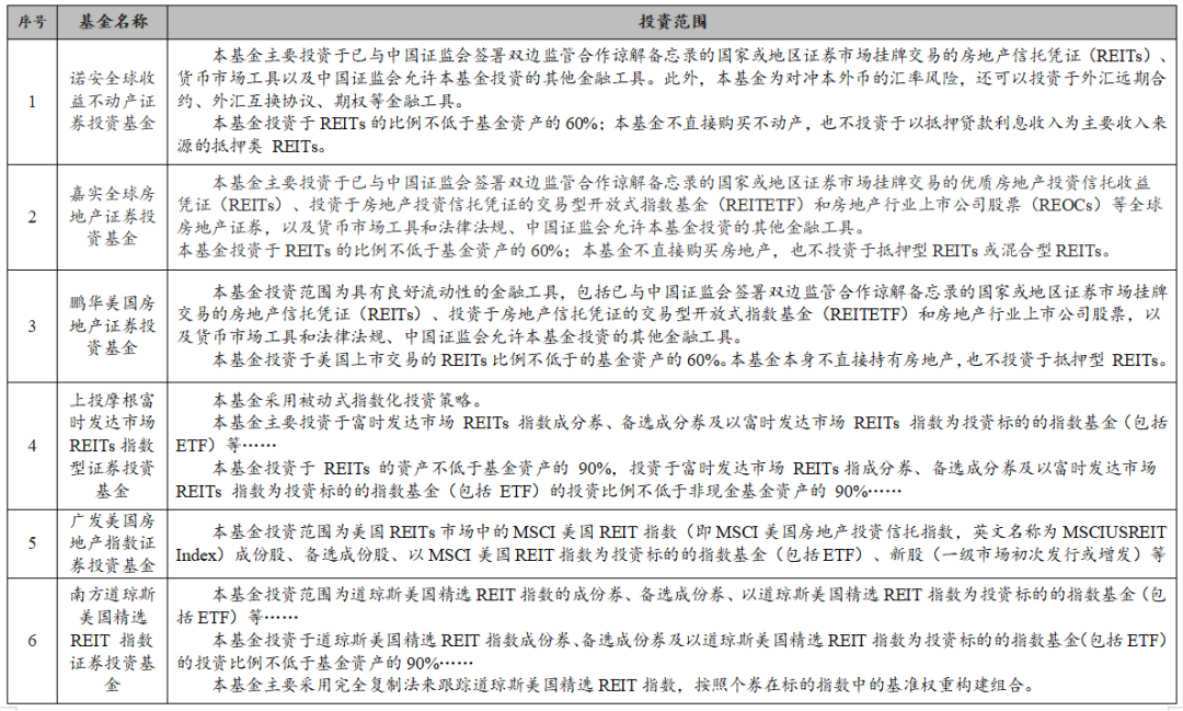 由于國內(nèi)目前并沒有真正意義上的REITs,投資者主要通過借道QDII基金投資的海外REITs。據(jù)小編查詢,國內(nèi)市場投資REITs的公募基金共6只,均為QDII基金(其中3只為被動式指數(shù)基金)。境外REITs和境內(nèi)基礎(chǔ)設(shè)施REITs本質(zhì)相同,通過QDII基金的資產(chǎn)配置策略可以了解REITs基礎(chǔ)資產(chǎn)的研判要點,亦可以作為承做端的重要參考。