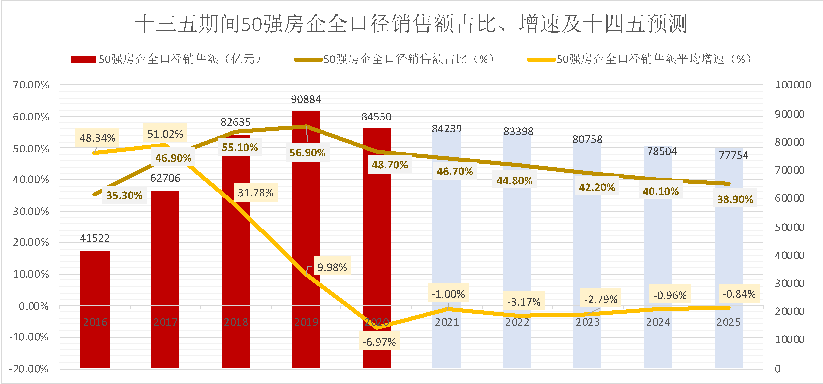 • 參照十三五期間百強房企銷售額占比,十四五期間百強房企銷售額市場份額仍將繼續上升,預計還有約10%的增長空間;