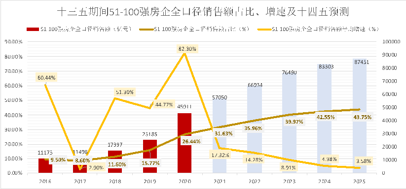 • 預計51-100強房企銷售額會在十四五期間繼續保持增長,但是隨著大盤子的增速放緩以及50強房企的規模擠壓,增速會呈現回落,但份額依然有穩步做大的空間。