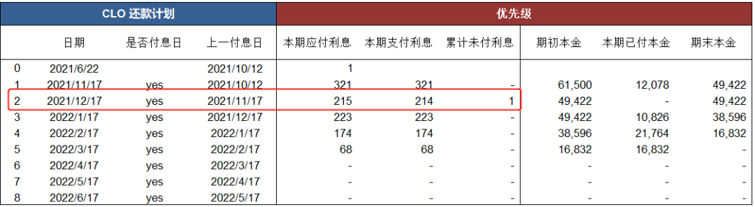 在現(xiàn)金流分布不均勻的情況下,可能因?yàn)閭€(gè)別期數(shù)現(xiàn)金流入有限而導(dǎo)致當(dāng)期優(yōu)先級證券本息無法足額兌付,從而對分層結(jié)果產(chǎn)生較大影響。如果“優(yōu)先A”的分層占比由57.70%僅增加至57.88%,第二個(gè)支付日的優(yōu)先級利息則無法足額兌付: