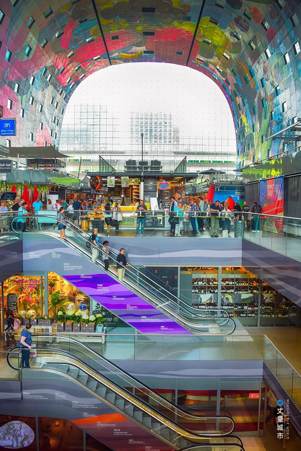 在與眾不同的外觀之余,鹿特丹菜市場還塑造了一個烏托邦式的美食童話。拱形的室內市場集結了販賣原料、佐料、加工副食品、餐飲、廚具等多個攤販;各店鋪開放透明極具設計感,讓美食購物也成為精致的享受。