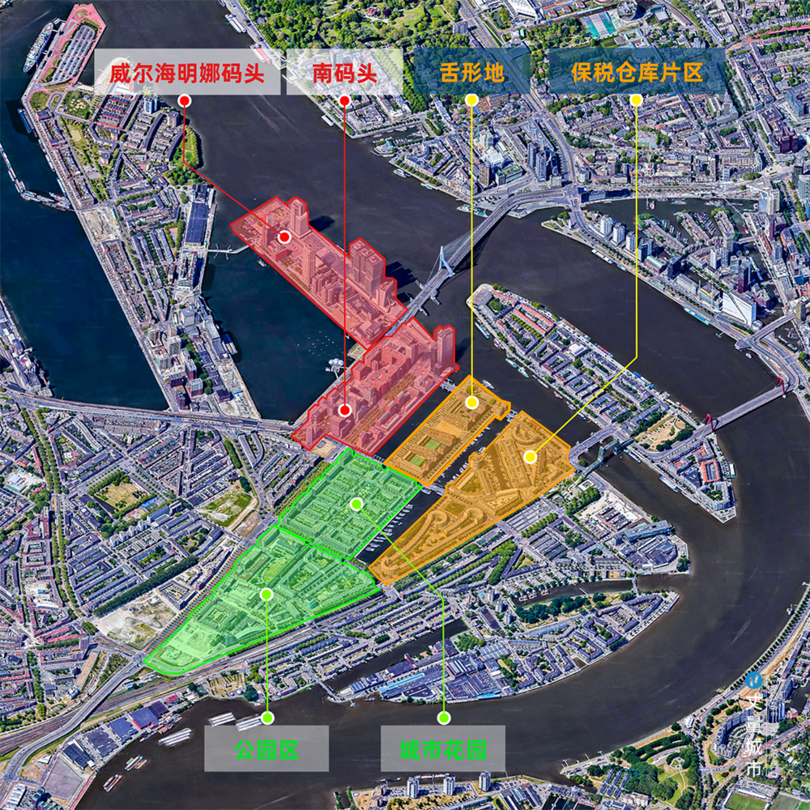 馬斯河北岸、南岸的港口區不應該是割裂城市的空間,而應該在保留港口特征的前提下,通過將每個港口區域根據其特點分別進行重新開發,將河流帶回城市中心,成為城市活躍的宜人空間和活力都心。