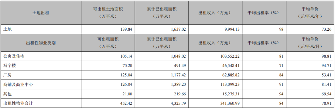 招商蛇口擁有的可出租物業(yè)總可出租面積 452.42萬(wàn)平米,包含公寓、住宅、別墅、寫(xiě)字樓、廠(chǎng)房、商鋪及商業(yè)中心等多種業(yè)態(tài)。報(bào)告期內(nèi),公司實(shí)現(xiàn)出租收入34.14億元,同比增加 17.98%,總體出租率84%。
