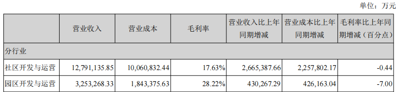 招商蛇口實(shí)現(xiàn)營(yíng)業(yè)收入1606.43億元,同比增長(zhǎng)23.93%。凈利潤(rùn)103.72億元,同比下降15.35%。社區(qū)開(kāi)發(fā)與運(yùn)營(yíng)毛利率為17.63%;園區(qū)開(kāi)發(fā)與運(yùn)營(yíng)毛利率降至28.22%。