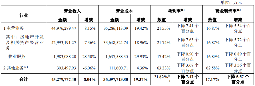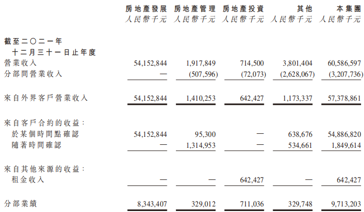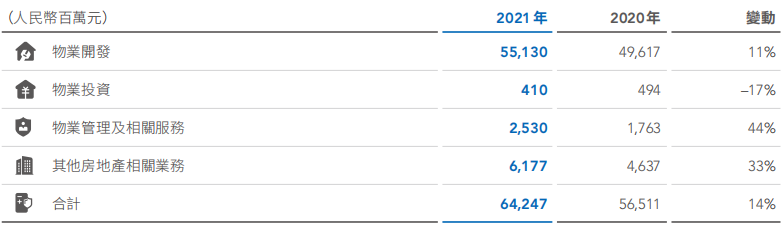 營(yíng)業(yè)收入中,來(lái)自房地產(chǎn)開(kāi)發(fā)及相關(guān)資產(chǎn)經(jīng)營(yíng)業(yè)務(wù)的營(yíng)業(yè)收入為4,299.3億元;來(lái)自物業(yè)服務(wù)的營(yíng)業(yè)收入為198.3億元。