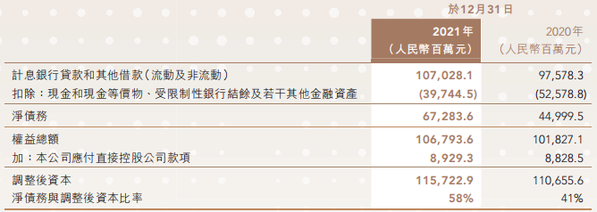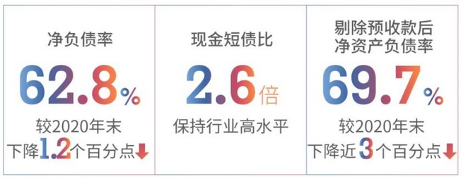 報(bào)告期間內(nèi),截至2021年末,碧桂園總有息負(fù)債下降至3179.2億元,凈負(fù)債率45.4%,同比優(yōu)化10.2個(gè)百分點(diǎn)。凈負(fù)債率、現(xiàn)金短債比均優(yōu)于“三道紅線(xiàn)”要求,且處在行業(yè)較優(yōu)水平,剔除預(yù)收賬款的資產(chǎn)負(fù)債率也從2020年底的80%下降至74%。