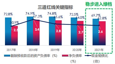 報(bào)告期間內(nèi),凈負(fù)債率為62.8%,現(xiàn)金短債比為2.6,剔除預(yù)收賬款的資產(chǎn)負(fù)債率為69.7%,達(dá)到了三條紅線(xiàn)的要求,步入綠檔陣營(yíng)。