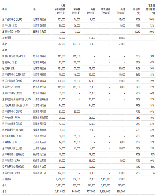 截至2021年年末,遠(yuǎn)洋集團(tuán)合共持有超過(guò)23個(gè)經(jīng)營(yíng)中投資物業(yè)。截至2021年末,集團(tuán)可租賃面積合共3,923,000平方米,其中寫(xiě)字樓占比約24%,物流項(xiàng)目約為48%,其他包括商業(yè)、車(chē)位及其他占比約28%。
