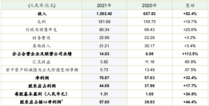 報(bào)告期間內(nèi),營(yíng)業(yè)收入達(dá)到1002億元,同比增長(zhǎng)52.4%;年內(nèi)利潤(rùn)76.87億元,較去年增長(zhǎng)33.4%;核心凈利潤(rùn)57.65億元,同比增長(zhǎng)44.4%;每股盈利達(dá)到1.31億元,同比增長(zhǎng)24.8%。