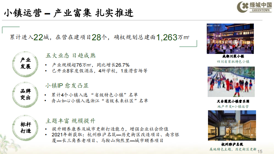 小鎮(zhèn)業(yè)務(wù)方面,小鎮(zhèn)規(guī)模穩(wěn)步提升,截至2021年底,小鎮(zhèn)業(yè)務(wù)累計(jì)進(jìn)入22城,在營(yíng)在建項(xiàng)目28個(gè),確權(quán)規(guī)劃總建筑面積約1,263萬(wàn)平方米。小鎮(zhèn)業(yè)務(wù)通過(guò)可售物業(yè)和產(chǎn)業(yè)經(jīng)營(yíng)「雙輪驅(qū)動(dòng)」。