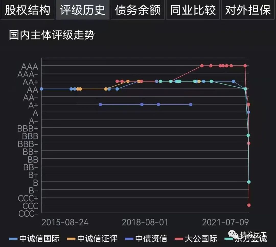 藍(lán)光發(fā)展的實(shí)際控制人是楊鏗,是四川省最大的房地產(chǎn)開(kāi)發(fā)公司,位列2020年中國(guó)房地產(chǎn)企業(yè)銷售排行榜操盤金額第39位。。藍(lán)光發(fā)展的評(píng)級(jí)機(jī)構(gòu)包括中誠(chéng)信國(guó)際、大公國(guó)際和東方金誠(chéng),主體信用評(píng)級(jí)最高達(dá)到AAA,目前最新評(píng)級(jí)為CCC。近年來(lái),藍(lán)光發(fā)展的信用評(píng)級(jí)經(jīng)歷了大起大落,評(píng)級(jí)變動(dòng)主要是集中在2021年6月份以來(lái)。此次債券違約之后,預(yù)計(jì)主體信用評(píng)級(jí)可能會(huì)進(jìn)一步下調(diào)。