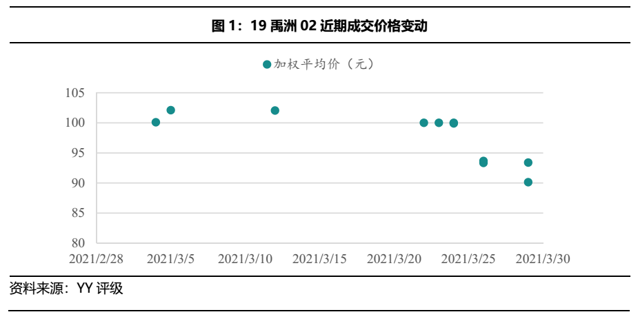 由于2020年初的黑天鵝事件使得房企在銷售和建設進度上均受到了一定影響,因而盈利預警在市場激起的水花并不大。但是3月25日,禹洲在補充公告中披露公司2020年未經審核的凈利潤和歸母凈利潤分別為2.282億元和1.17億元,較2019年度分別減少37.39億元和35.94億元,降幅之大遠超市場預期,引起一片嘩然,疊加穆迪下調公司的企業家族評級(由下調至“B1”,展望調為“負面”),所以盡管公司管理層在3月26日開了一個簡短的線上溝通會,強調自身銷售、運營和現金流仍然保持穩健,沒有受到影響,但并未提振市場信心,禹洲境外多只美元債創新低,境內債“19禹洲02”在接下來的幾個工作日也遭到拋售,價格跌破95元。