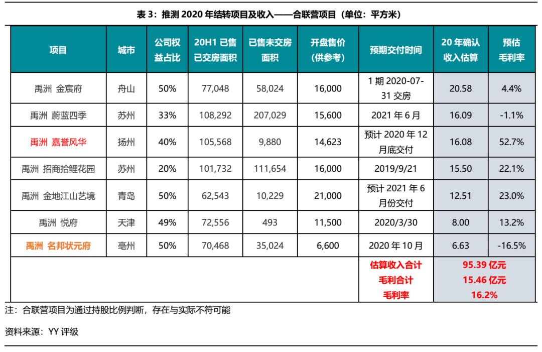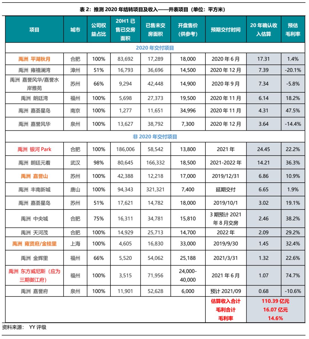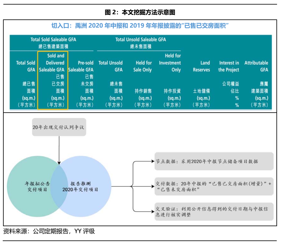 挖掘方法:因房企于資產控制權轉讓至客戶(房屋交付)時確認收入,根據禹洲定期報告對土儲的詳細披露,我們以“已售已交房面積”為切入口,通過對比2020中報的各項目“已售已交房面積”相對于2019年報相同科目的增量,可以得到2020年上半年交房了一部分的項目。這些項目無論是否并表,均體現在2020年利潤表中。