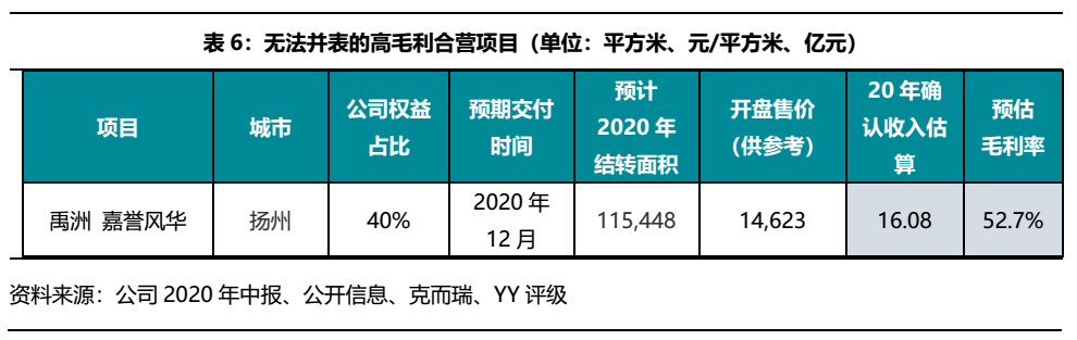 位于揚州的禹洲嘉譽風華項目,截至2020年6月末公司權益占比為40%,公司稱上半年計入非全資子公司,并將收入并表;但是全年審計時,審計師出于謹慎認為未達到并表條件(此時也來不及補充協議條款)。也就是說,公司原本有把握做并表的項目最后放入了聯營公司,導致收入無法體現。經估算,該項目2020年結轉收入在16億元,毛利在8.5億元,這是2020年結轉的合聯營項目中為數不多的高毛利項目。