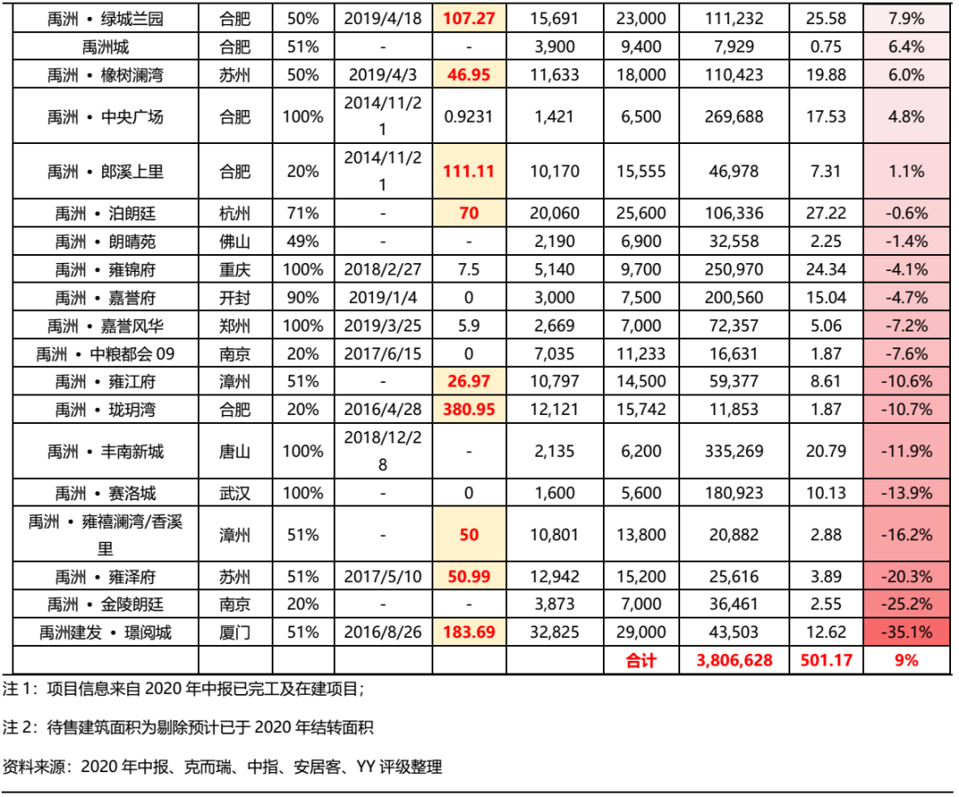 結合拿地時間、溢價率等信息,我們發現這些項目多購于2016-2019年間,正是禹洲為了沖規模激進拿地的時候,溢價率普遍高企,合肥的平湖秋月項目溢價率甚至高達177%,2020年盈利大幅縮水為過往幾年高價拿地的后遺癥。從待售比例來看,大部分項目已經基本去化,于2020年計虧,但值得注意的是,還有2個虧損項目和1個低毛利率項目還有較多未售比例,還需在往后的經營和財報中予以消化。