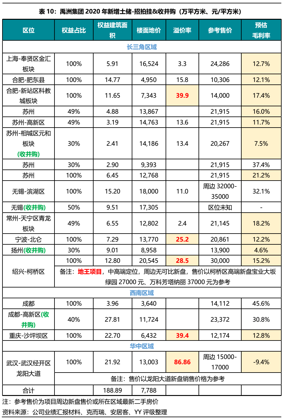 截至2020年12月31日,公司披露的總土儲為2,310萬平方米,總貨值約4,559億元,權益占比62%,并表比例60%,看起來充裕。但根據我們之前報告中對于禹洲中報披露的土儲口徑的拆分(公司2020年中報披露土儲全口徑為2023.83萬平方米,實際可售部分為1,147.12萬平方米,即打六折)來推測,公司實際可售土儲并不如看起來豐厚,若簡單粗暴按照六折估計,再乘以權益比(合作開發占比較大),則權益土儲約785萬平方米,有效貨值則為1,700億元(此為線性外推,仍以后續公司披露的土儲明細為準)。