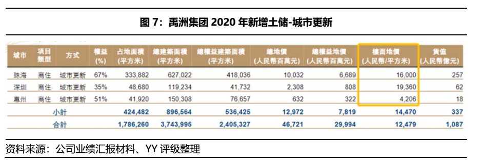 3個新增的城市更新項目分別位于珠海、深圳和惠州,除深圳項目以外,考慮到珠海和惠州近期平均房價分別為2.18萬元和1萬元/平方米,公司的拿地成本不占優勢,且城市更新項目通常轉化速度慢,該部分貨值預計回報期較長。