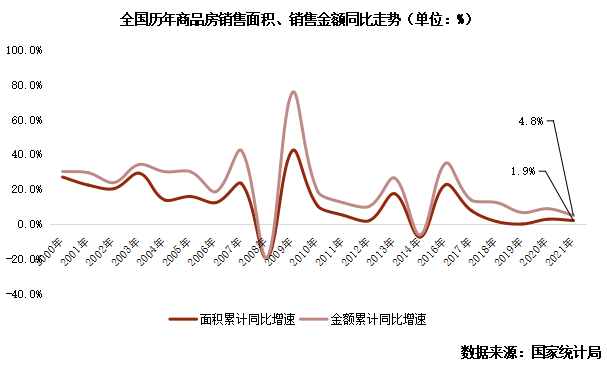 據國家統計局數據:2021年,商品房銷售面積17.9億平方米,比上年增長1.9%;商品房銷售額18.2萬億元,增長4.8%。2021年上半年和下半年商品房銷售面積分別同比增28%和降15%。可見上半年較好的市場表現是全年創新高的主要支撐。