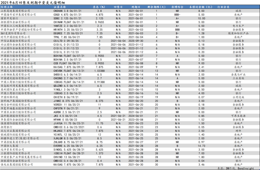 金融板塊共計15家主體20筆美元債面臨回售/到期,涉及主體主要為銀行及金融服務類,待償金額合計69.48億美元,為6月最大板塊。其中票息最高的是遠洋資本有限公司的SINOCL 5.625 06/28/21,票息5.625,待償金額3億美元。
