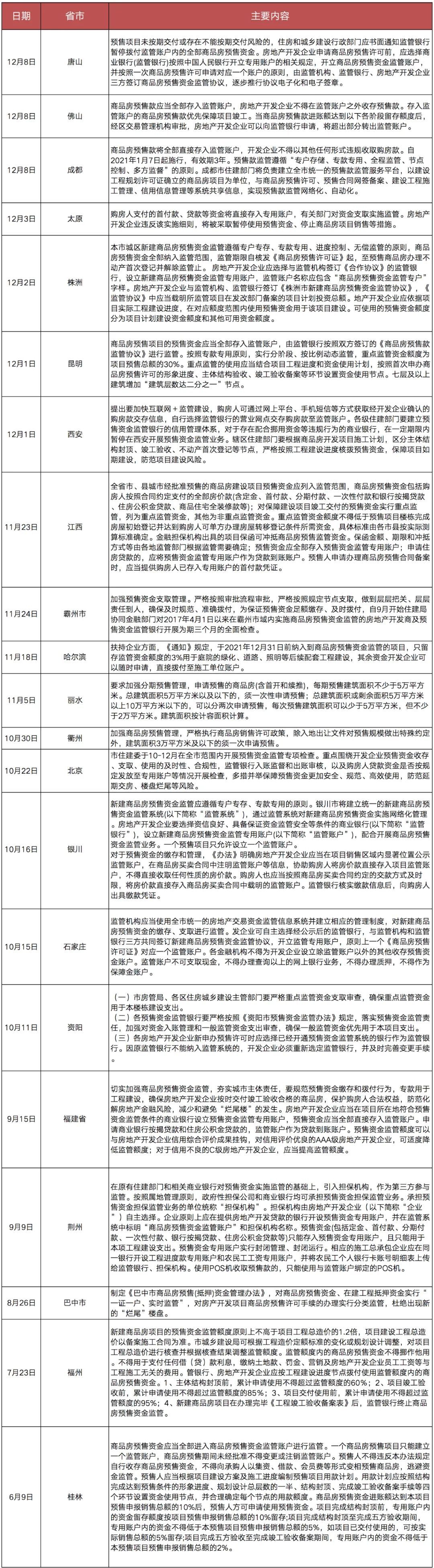 2020年以來,已有二十余省市出臺加強預售資金監(jiān)管的相關政策或實施細則,且內容主要集中于“專戶專存、專款專用、全程監(jiān)管、節(jié)點控制”四個方面。