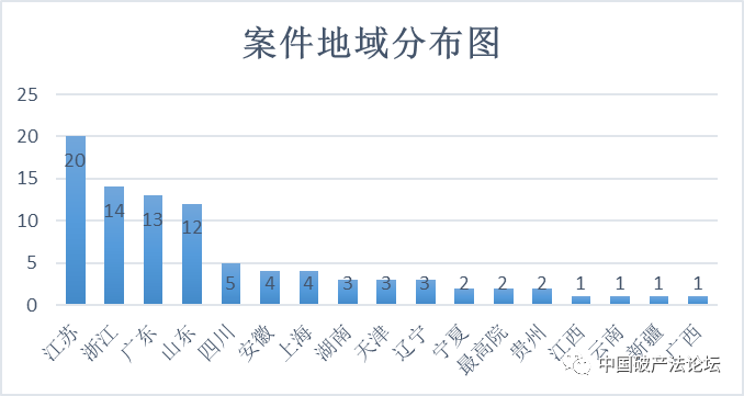 如圖1-2所示,公開檢索的案件數量在地域上亦有集中分布的趨勢,主要集中在長三角地區,占比約37%,廣東省占比約11%,山東省占比約10%。其他省份的案件數量在5件以下。