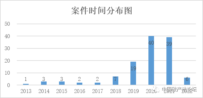 如圖1-1所示,公開檢索的案件數量在2018年前,每年案件分布比較均勻,且案件量較小,2018年起有顯著的增加,2020年和2022年基本穩定在40件左右,鑒于2022年度尚未完結,相關數據尚不完整。2020至2022年度截至目前的案件數量已占約70%。