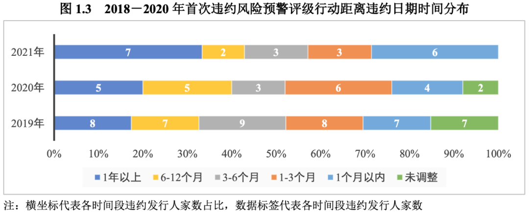2021年我國債券市場23家新增違約發行人中有21家在違約前具有有效信用等級,違約發生前評級機構均通過各類評級行動進行了風險預警[5],違約前3年內首次違約風險預警評級行動日期距離違約日期時間在1個月以內的有6家,1~3個月(含)的有3家,3~6個月(含)的有3家,6~12個月(含)的有2家,1年以上的有7家;首次違約風險預警評級行動日期距離違約日期的均值約為229天,較2020年(192天)和2019年(184天)有所增加。整體來看,評級機構對違約發行人提前6個月、提前1年進行風險預警的比例較2020年和2019年均有所上升,信用風險預警能力有所改善,但預警及時性仍有待提高。