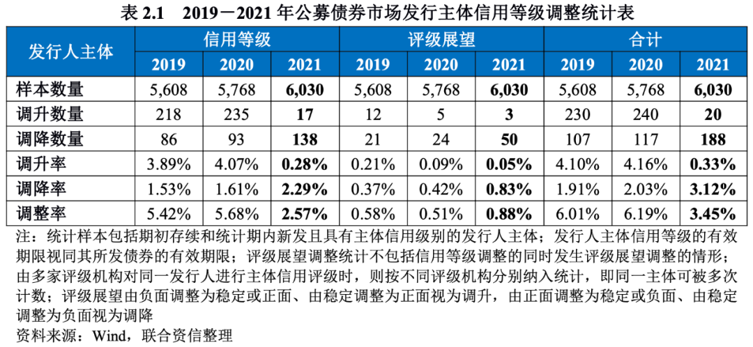 2021年,公募債券市場上共有155家發行主體信用等級發生調整,調整率為2.57%,較2020年(5.68%)下降3.11個百分點,較2019年(5.42%)下降2.85個百分點。其中信用等級被調升的發行人有17家,調升率為0.28%,較2020年(4.07%)下降3.79個百分點,較2019年(3.89%)下降3.61個百分點;信用等級被調降的發行人有138家,調降率為2.29%,較2020年(1.61%)上升0.68個百分點,較2019年(1.53%)上升0.76個百分點。整體來看,2021年公募債券市場評級穩定性較2020年和2019年有所提升,信用等級轉為調降趨勢。