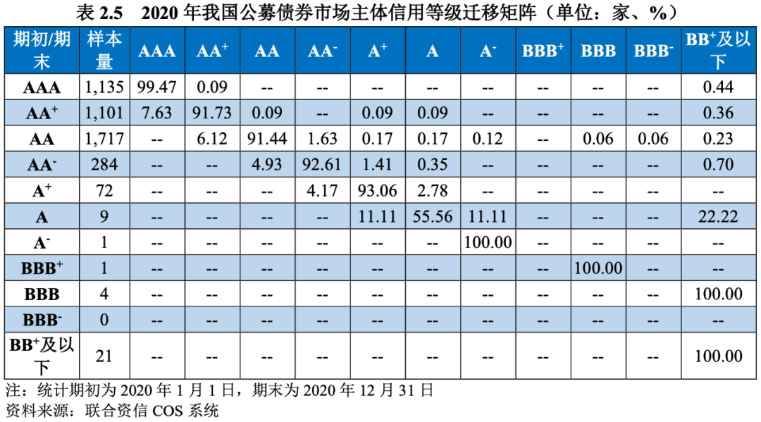 從信用等級遷移矩陣來看,在樣本數量較多的AA-級及以上級別中,各級別穩定性均較好,級別未發生遷移的比率均在90%以上,AA+級、AA級和AA-級穩定性較2020年和2019年均有不同程度上升;整體穩定性與2020年和2019年相比均有所提升。