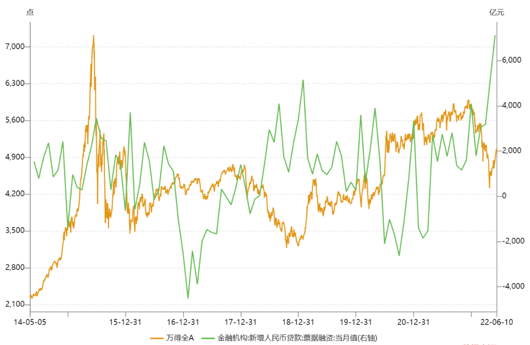 而票據(jù)融資這個調(diào)解信貸數(shù)據(jù)使用的工具,則與股市呈現(xiàn)反向關(guān)系。銀行需要靠票據(jù)貼現(xiàn)去沖信貸規(guī)模,說明實(shí)體不景氣,對應(yīng)的股票市場往往是熊市,2018年體現(xiàn)的尤其明顯。