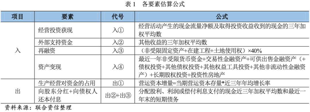 ③再融資,其中,股權(quán)融資通常分為兩種情況,一是企業(yè)自身或其子公司通過轉(zhuǎn)讓少數(shù)股權(quán)引入戰(zhàn)略投資者,二是通過含回售條款的股權(quán)轉(zhuǎn)讓進(jìn)行融資,考慮普遍性和數(shù)據(jù)可得性等問題,此處暫不對股權(quán)再融資金額進(jìn)行估算;債權(quán)融資方面,通常情況下,企業(yè)能夠獲得一定數(shù)量的信用借款,但如果出現(xiàn)外部信用環(huán)境收緊,或企業(yè)出現(xiàn)負(fù)面輿情的情況下,信用借款可能會面臨大幅收縮,而以資產(chǎn)抵押為增信條件的再融資則相對可靠,所以這里對再融資的估算將以資產(chǎn)規(guī)模為依據(jù)。對于可用于抵質(zhì)押融資的資產(chǎn)范圍的界定,從資產(chǎn)流動性的角度,將資產(chǎn)分為處置后不影響生產(chǎn)經(jīng)營的資產(chǎn)和生產(chǎn)經(jīng)營所必需的資產(chǎn),前者雖然也能夠用于抵質(zhì)押再融資,但為了避免與資產(chǎn)變現(xiàn)的重復(fù)計(jì)算,此處只考慮能夠抵押再融資的生產(chǎn)經(jīng)營涉及的資產(chǎn),即非受限的“固定資產(chǎn)+在建工程+土地使用權(quán)”,這些資產(chǎn)在抵押過程中能夠獲得的貸款金額和資產(chǎn)的賬面價(jià)值通常存在一個(gè)折價(jià)比例,尤其是在建工程,這里折價(jià)比例暫用40%做一個(gè)估計(jì),后期可以根據(jù)銀行放貸的實(shí)際政策進(jìn)行調(diào)整。