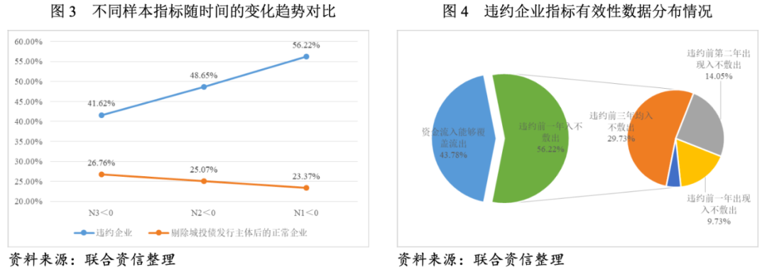 ①要素不全面,即由于外部支持資金、投資支出等要素的隨機(jī)性較大,預(yù)測準(zhǔn)確性較低,現(xiàn)有“入”和“出”的各要素未覆蓋全部的資金流入或流出渠道。例如,目前“入”中未包括外部支持資金中的股東注資或關(guān)聯(lián)方資金借貸、再融資中的信用融資帶來的資金流入等,這可能是導(dǎo)致正常經(jīng)營企業(yè)指標(biāo)持續(xù)為負(fù)的原因,但同時(shí)也可能反映出這些企業(yè)對外部支持和信用再融資的依賴度高,同樣也需要關(guān)注。