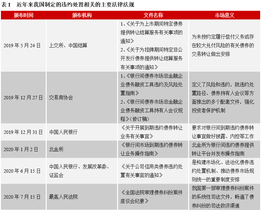 二是完善相關法律法規的建設?!豆痉ā泛汀蹲C券法》構成我國信用債券市場的基礎法律。近年隨著違約事件的頻發,違約處置相關的法規制度也在加速制定中,從法律定義、行政監管以及實際操作規范三個層次,搭建違約處置的基本框架(表1)。后續仍需在加強債券市場互通互聯、完善破產人管理制度、加大執法力度等方面繼續努力。