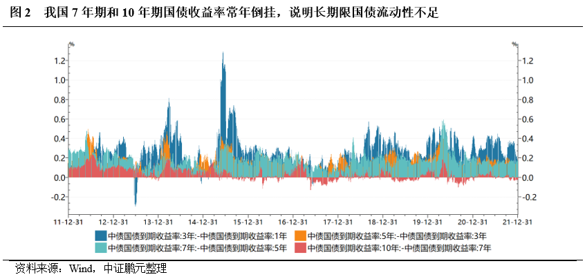 定價機制是金融市場資源配置的基石。成熟的定價機制能動態匹配風險與收益、引導資金合理流動、提升資源的配置效率;而扭曲的定價機制損害資源配置效率、劣幣驅逐良幣,時間長久后易積累成系統性風險,影響經濟健康發展。目前我國信用債券定價機制有如下幾個突出問題:一是缺乏權威基準利率,國債收益率作為使用最為廣泛的基礎利率,尚存在因長期限國債流動性不足而長短端利率倒掛(圖2)等問題,這不利于我國信用債券的定價、特別是長期限債券的定價;二是債券市場的分割導致定價機制不統一,企業融資利率一定程度上取決于渠道而非真實信用水平,從而形成渠道套利空間;三是常年形成的依賴土地等抵押品和政府信用的潛在風險定價因素,使得風險溢價水平與企業自身經營風險關聯性較弱。此外,定價系統的基礎設施建設也不足,銀行間、交易所市場要加強互聯互通,各機構也要逐步構建自身的收益率曲線與定價估值系統,建立健全自主定價報價流程和機制,全方位立體構建我國信用債券的定價體系。2022年1月20日,銀行間和交易所聯合發布《銀行間債券市場與交易所債券市場互聯互通業務暫行辦法》,為打通我國常年割裂的兩個交易市場邁出了實質性的一大步。