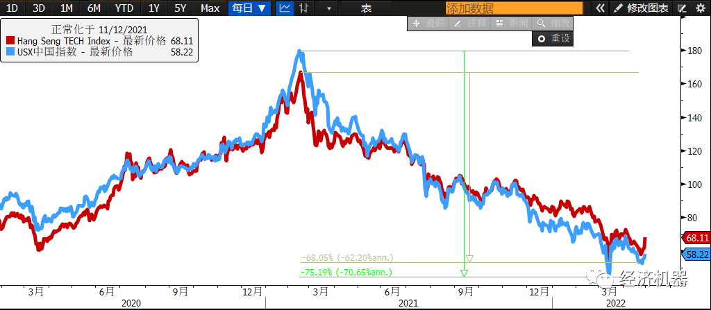 海外方面,紐約中概股金龍指數(shù)和香港恒生科技股指數(shù)則分別下跌了75%和68%(圖2),很多科技類核心資產(chǎn)跌幅顯著大于指數(shù)。
