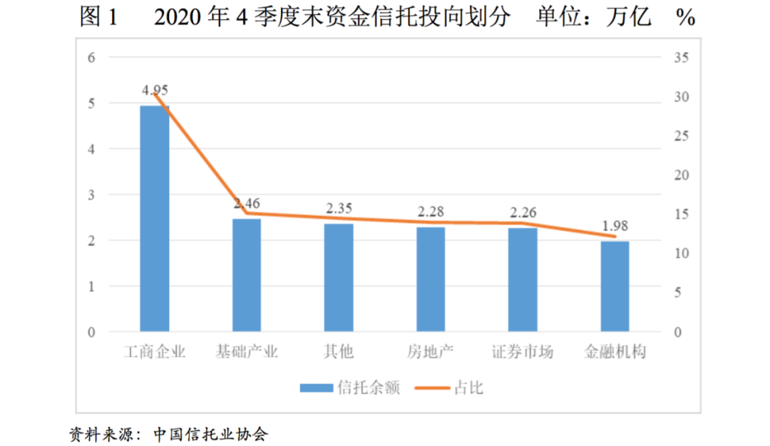 從目前信托資金投向來看,除卻工商企業外,城投和房地產行業是信托資金流向規模較大的兩個行業(如下圖1)。2021年初以來,監管層陸續出臺針對房地產和城投企業的融資監管政策或窗口指導意見,繼續強調嚴控資金投向房地產領域,嚴控投向城投的隱形債務增量。此次融資類信托的收緊,進一步限制了兩大行業的再融資渠道,加大了行業信用風險。